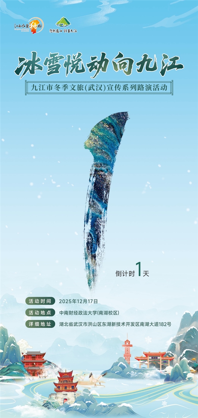 一场集结了精品推介、互动市集与惊喜好礼的九江文旅盛宴即将登陆武汉中南财经政法大学(南湖校区),为高校学子量身定制冬游攻略,精彩无限,就在“冰雪悦动向九江-九江市冬季文旅(武汉)宣传系列路演活动”推介现场,诚邀江城学子共赴这场冬日文旅之约,让九江的美景与你撞个满怀!
